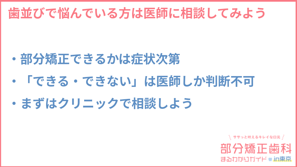 部分矯正で歯並びの悩みを解決できるかどうかは、症状によって異なります。部分矯正が「できる・できない」の判断は医師にしかできません。歯並びや噛み合わせのことで悩んでいる方は、確認も含めて、まずは医師に相談してみましょう。